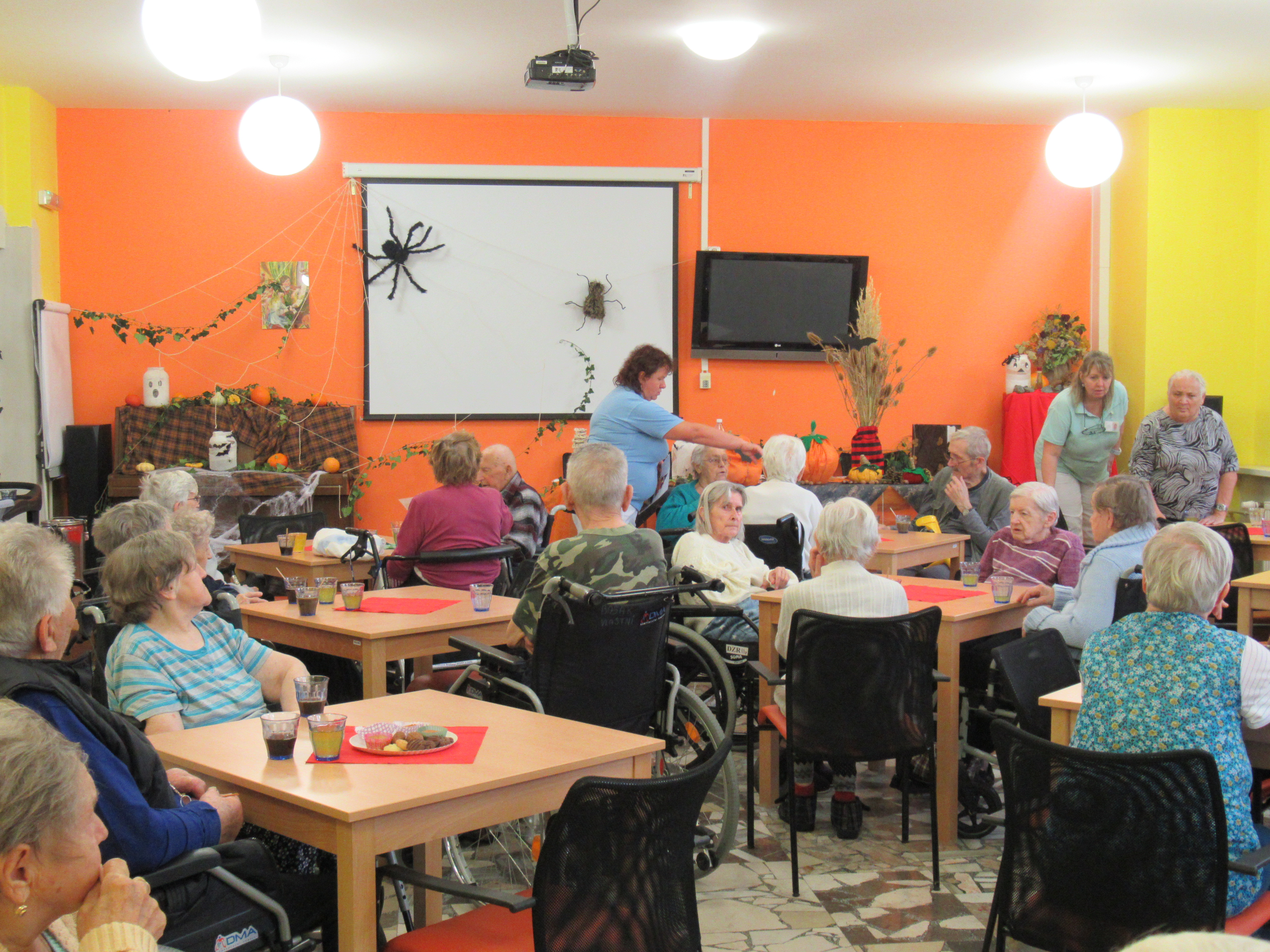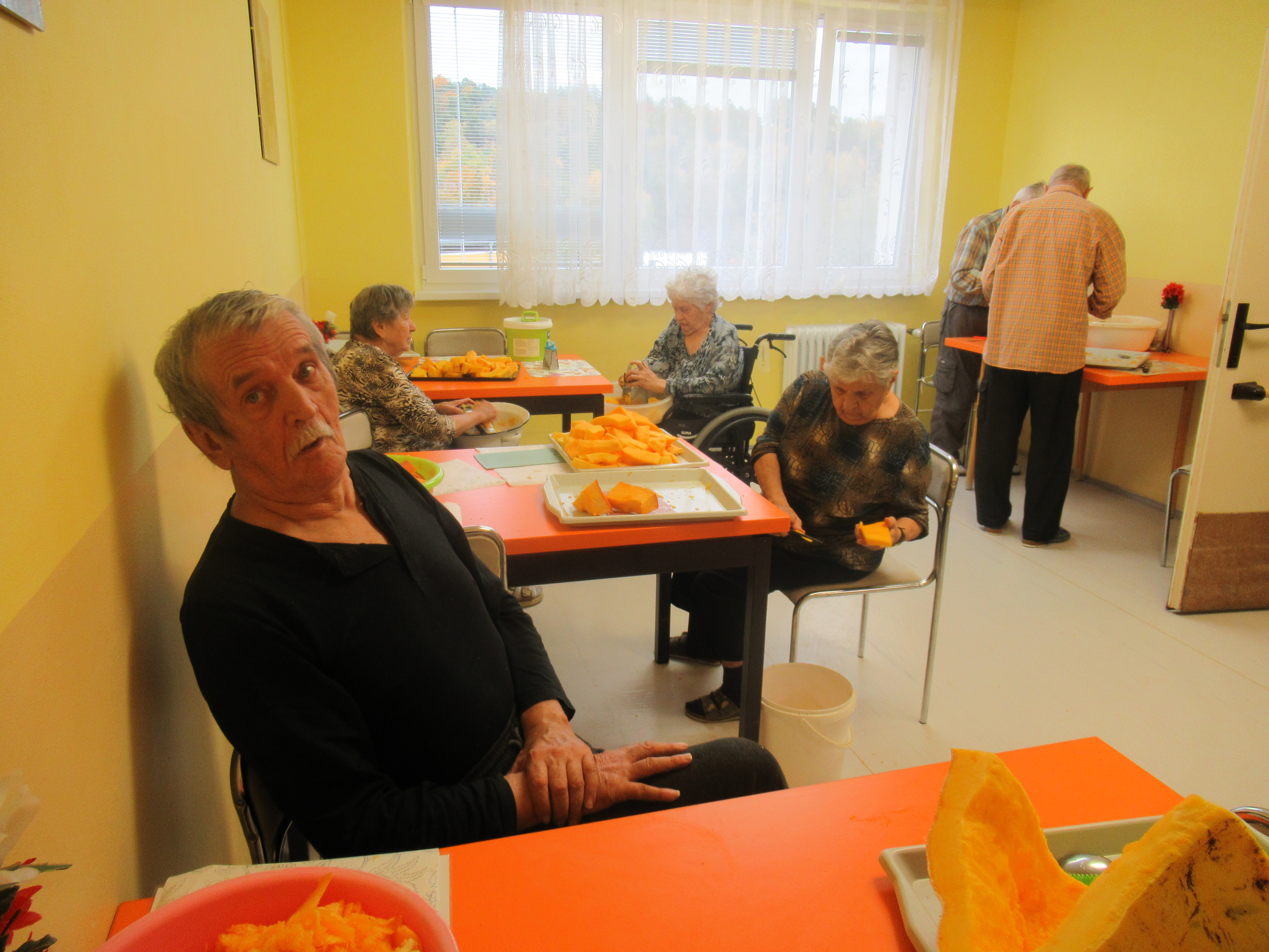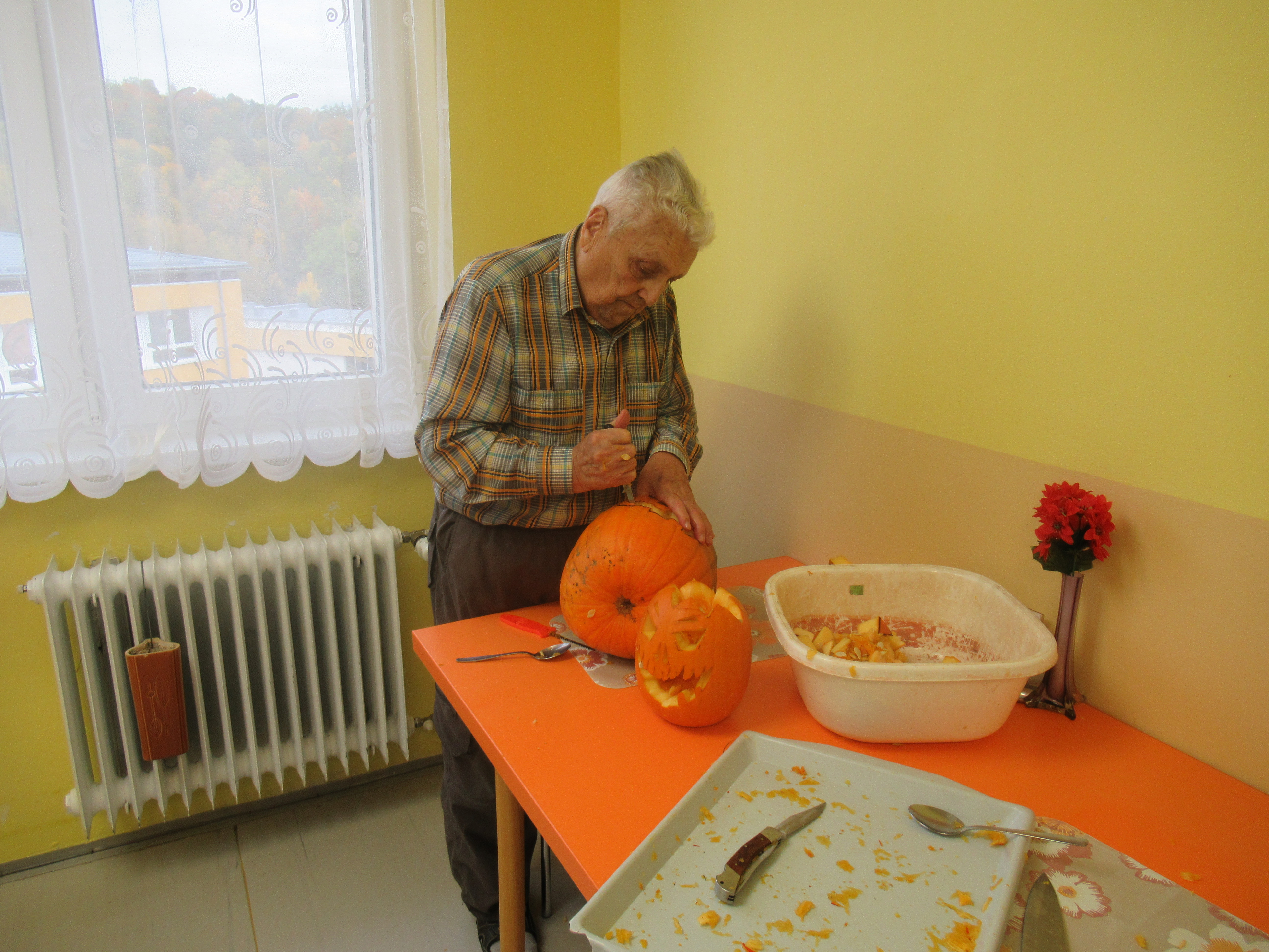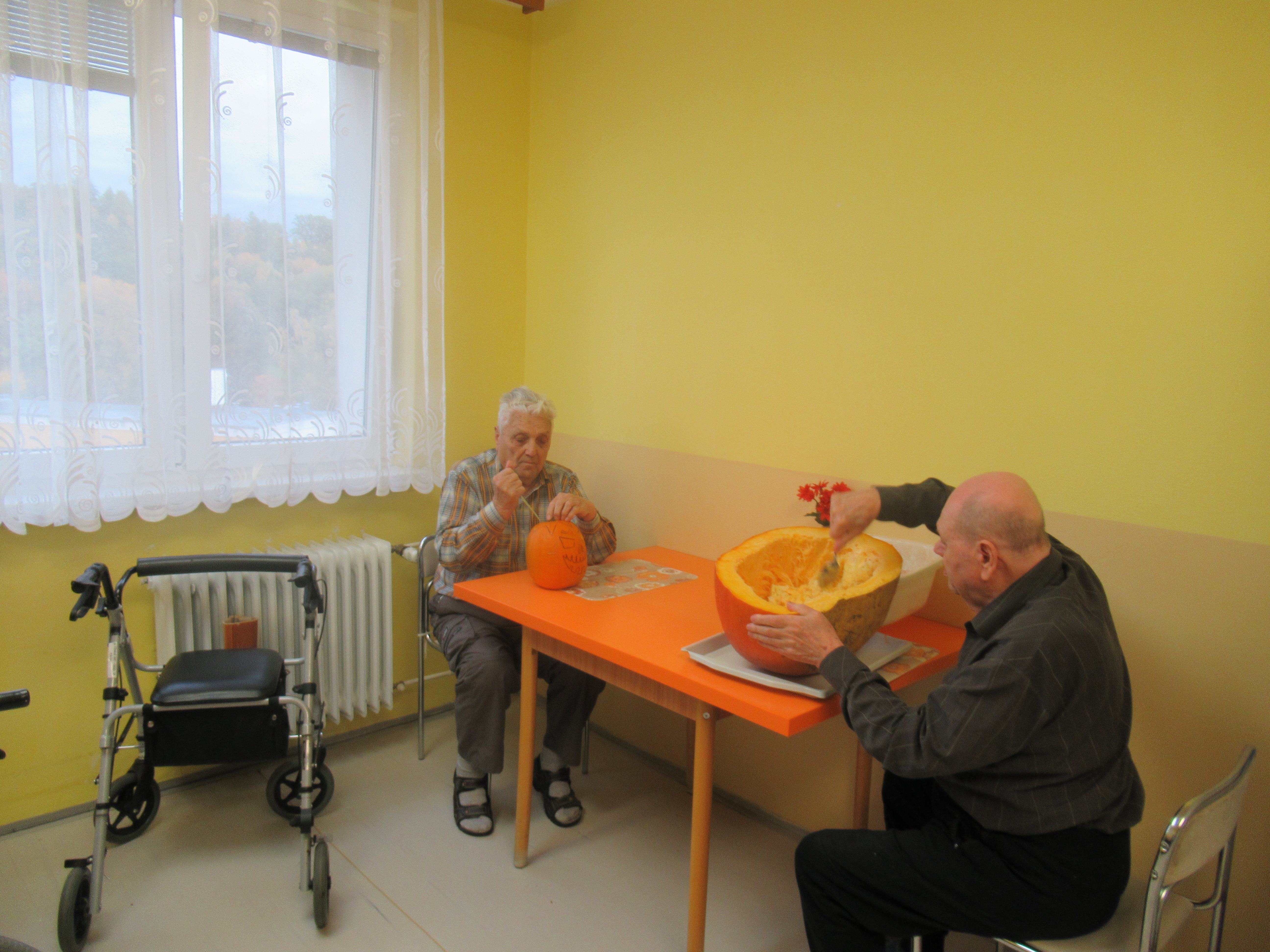 Halloween je původně keltský lidový svátek, který připadá na 31.10. a ve velké míře se už rozšířil i k nám. Slaví ho především mladí lidé a rodiny s dětmi, kteří se rádi převlékají do nejrůznějších masek. K Halloweenu patří také dlabání a vyřezávání dýní. Tento zvyk jsme praktikovali i u nás. Dopolední "dýňování" probíhalo tak, že nám naši uživatelé dýně vydlabali a vyřezali jim strašidelné obličeje. Větší dýně nám rozkrájeli a nastrouhali, abychom je mohly použít na pečení různých dobrot na odpolední posezení u kávy, ve velkém sále. Zde jsme našim uživatelům povyprávěly o tomto svátku a pro zajímavost jsme zmínily také pár kuriozit ze světa dýní. Akce měla dobré ohlasy a uživatelé si dobroty z dýní pochvalovali.