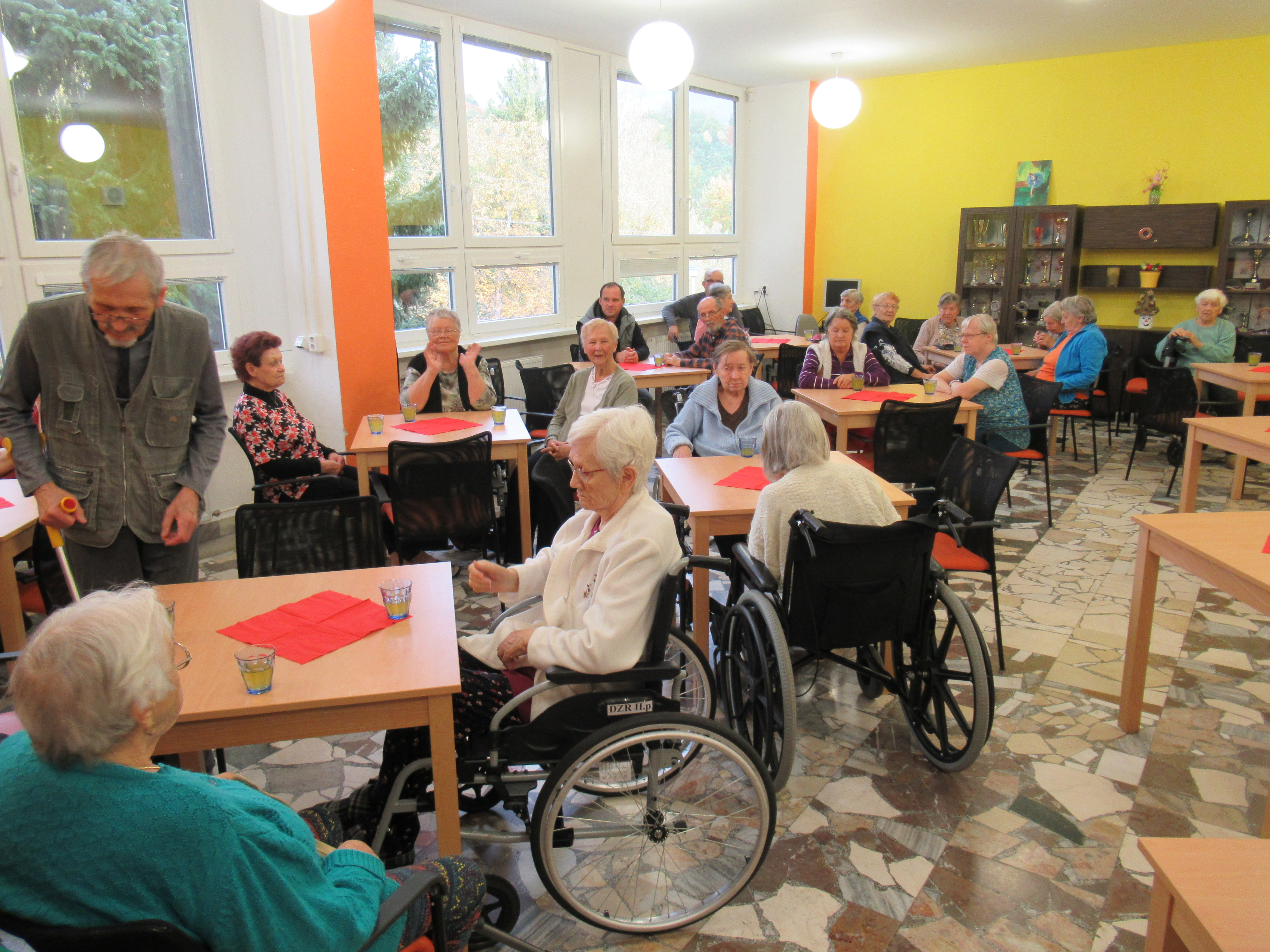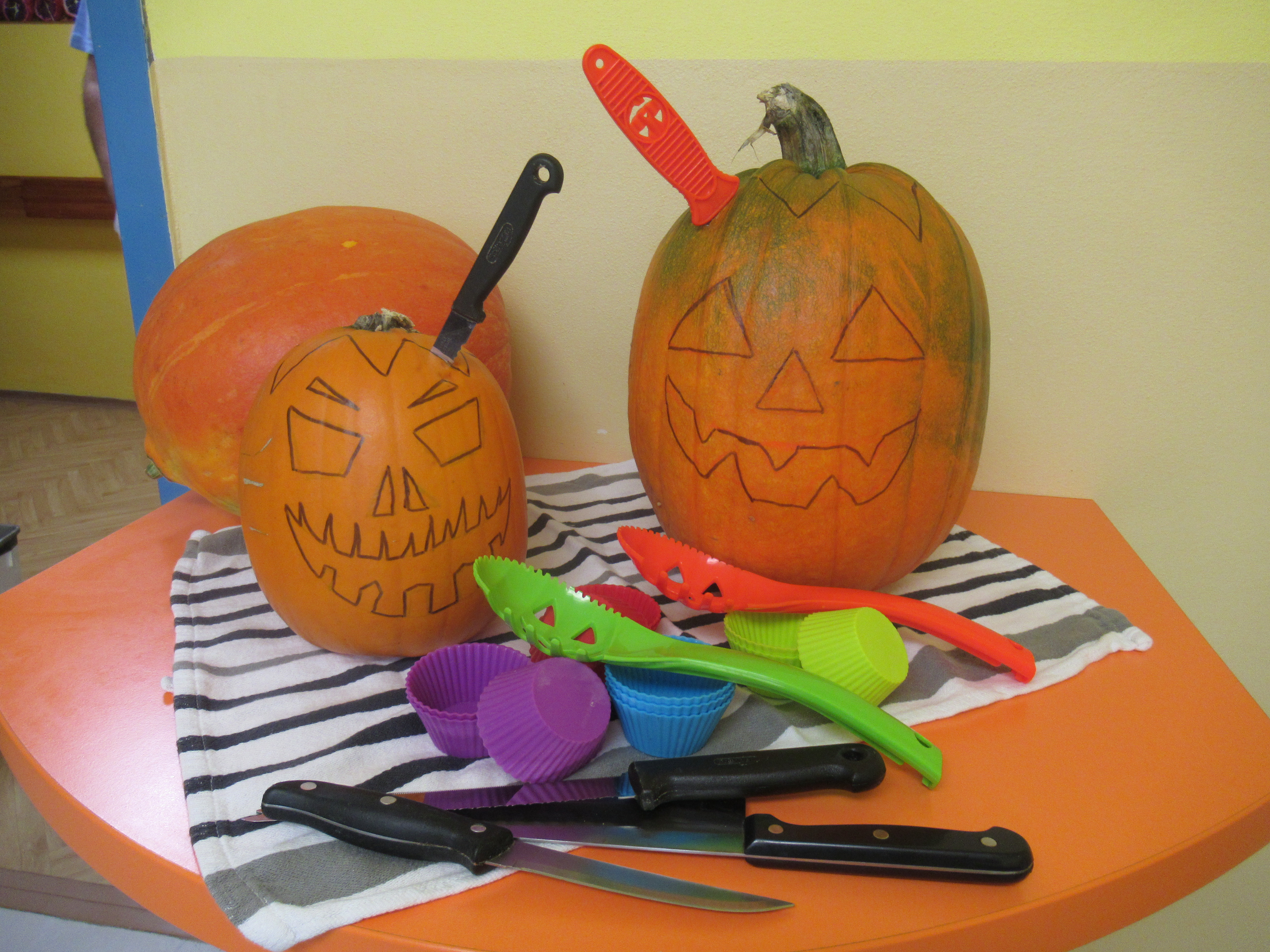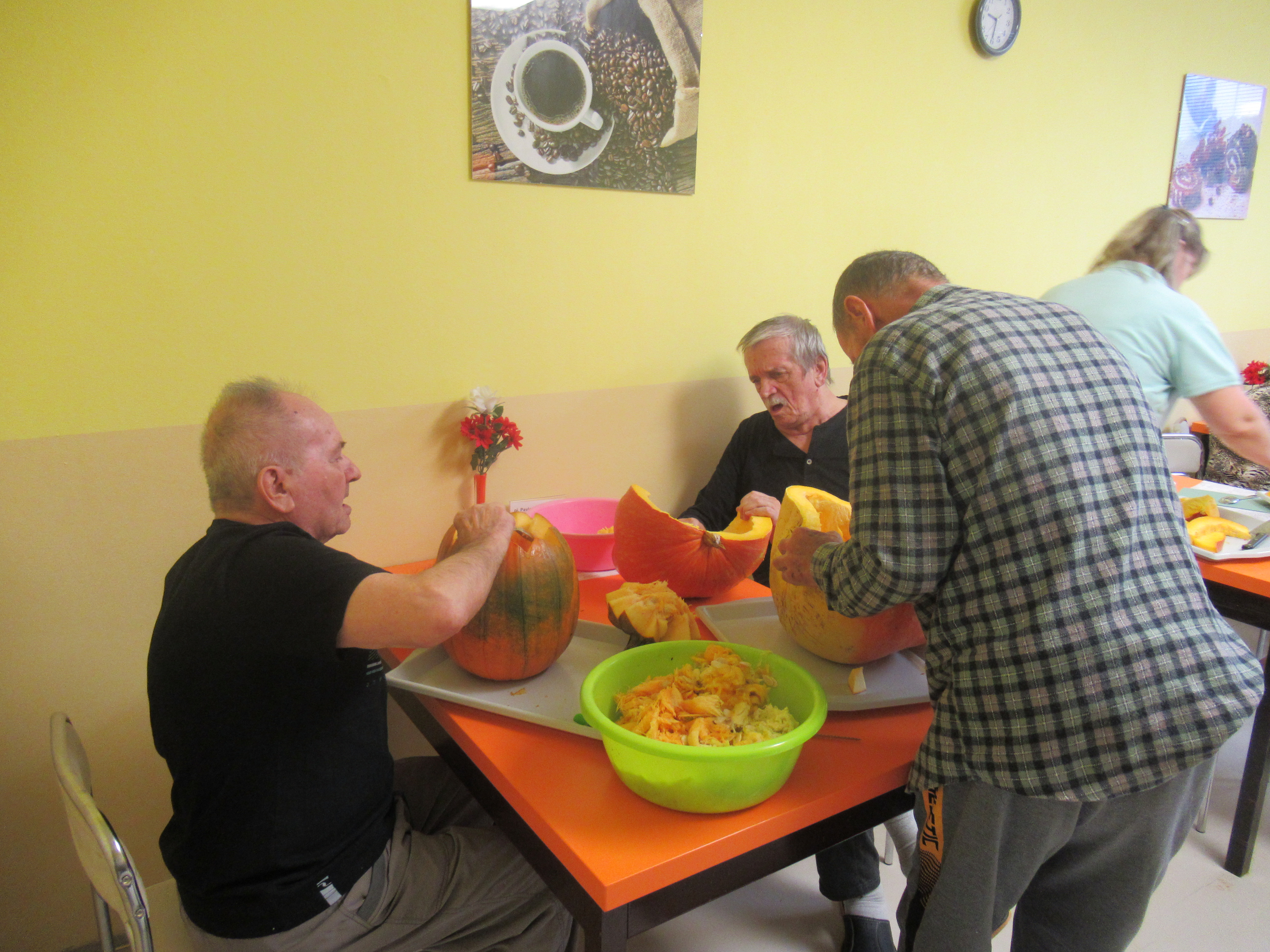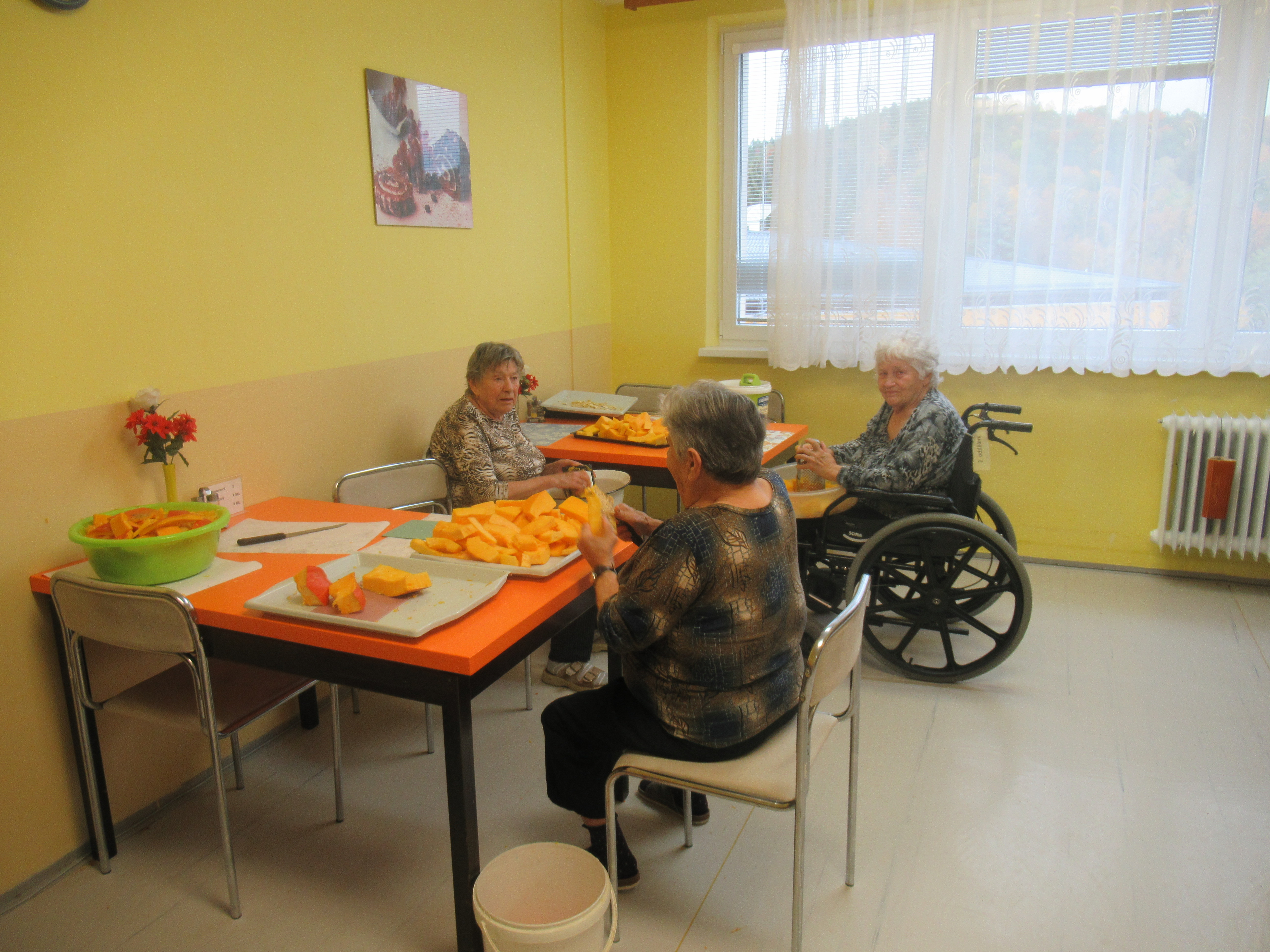 Halloween je původně keltský lidový svátek, který připadá na 31.10. a ve velké míře se už rozšířil i k nám. Slaví ho především mladí lidé a rodiny s dětmi, kteří se rádi převlékají do nejrůznějších masek. K Halloweenu patří také dlabání a vyřezávání dýní. Tento zvyk jsme praktikovali i u nás. Dopolední "dýňování" probíhalo tak, že nám naši uživatelé dýně vydlabali a vyřezali jim strašidelné obličeje. Větší dýně nám rozkrájeli a nastrouhali, abychom je mohly použít na pečení různých dobrot na odpolední posezení u kávy, ve velkém sále. Zde jsme našim uživatelům povyprávěly o tomto svátku a pro zajímavost jsme zmínily také pár kuriozit ze světa dýní. Akce měla dobré ohlasy a uživatelé si dobroty z dýní pochvalovali.