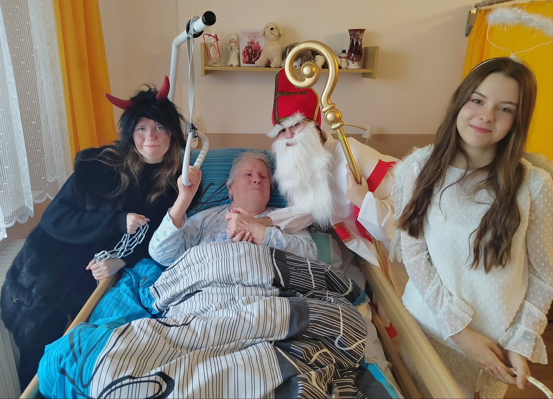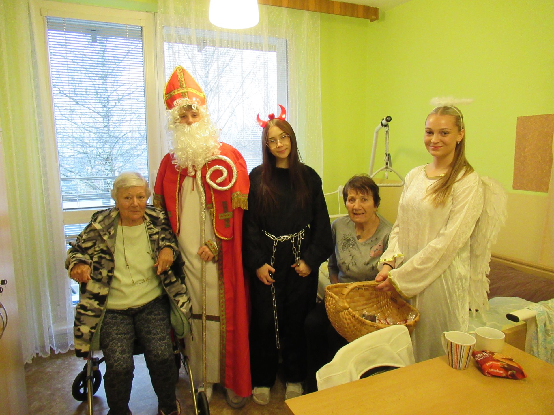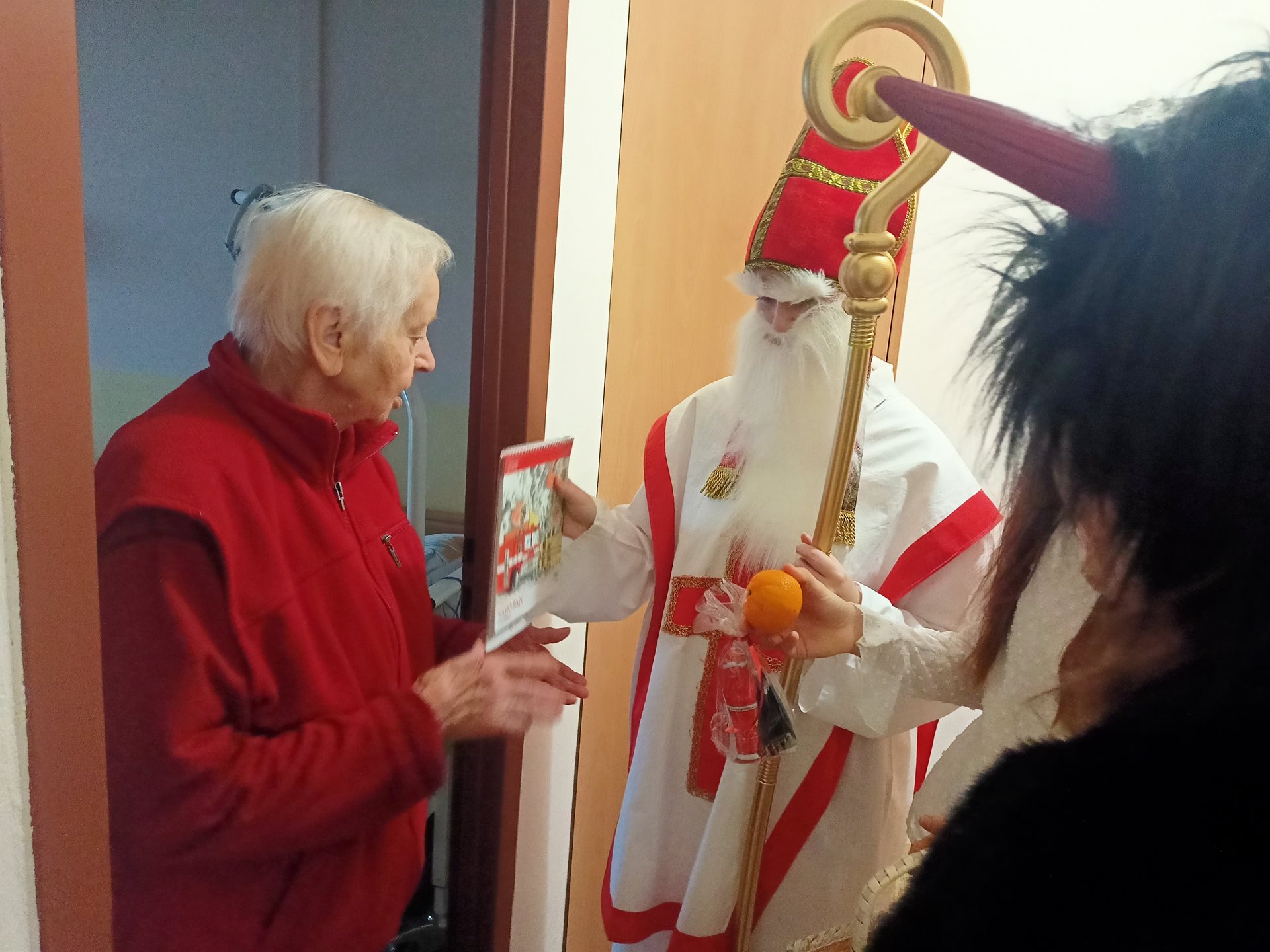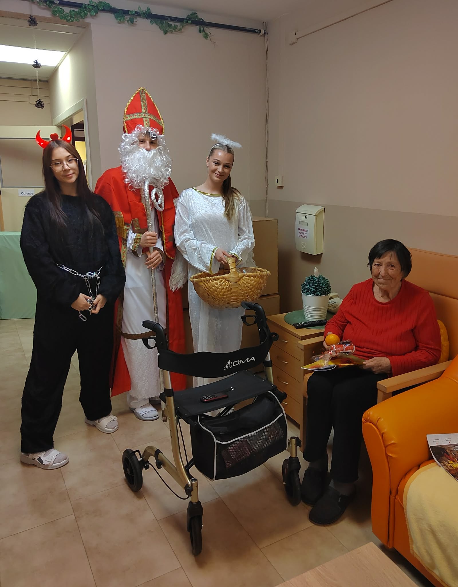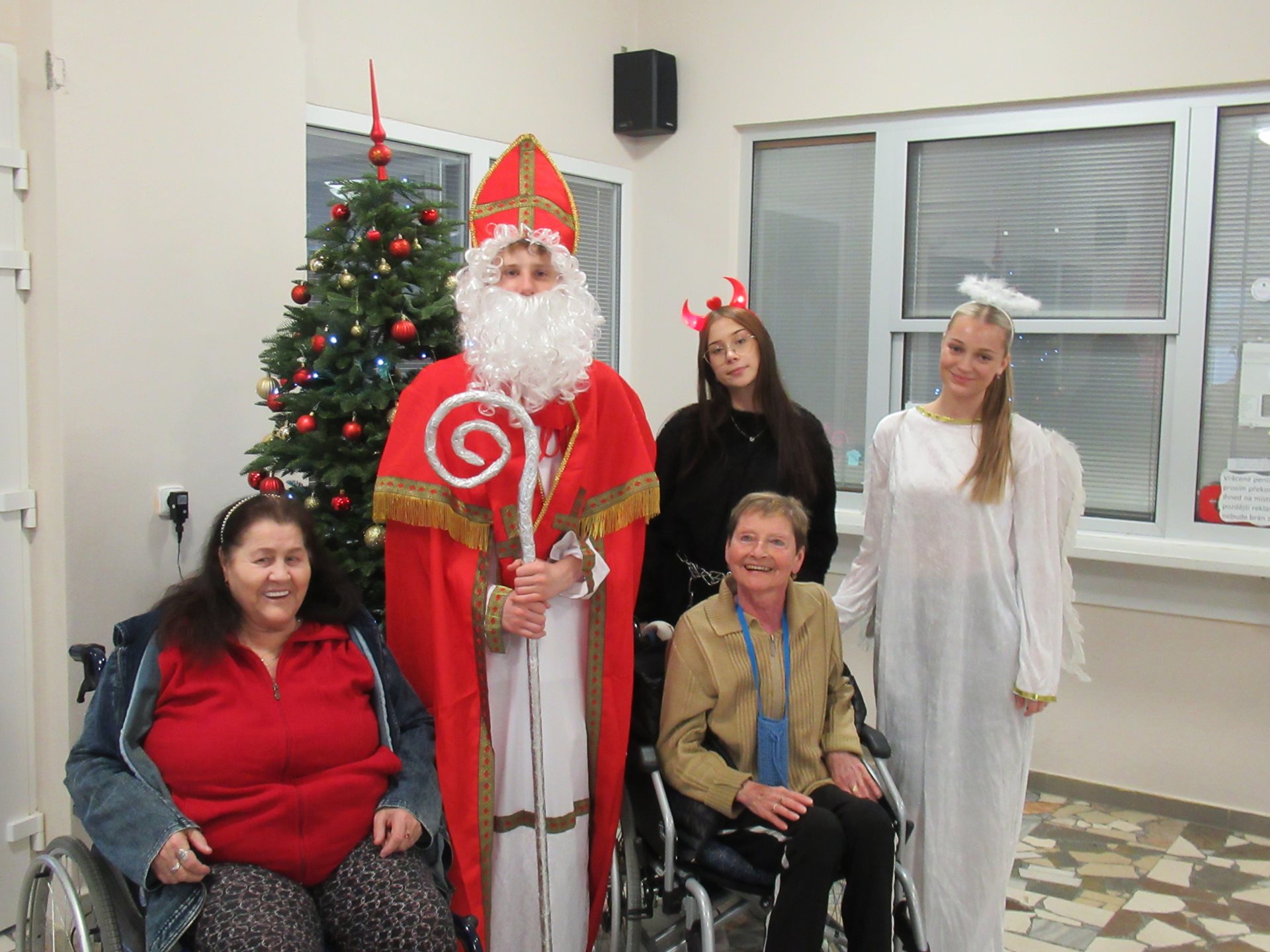 Domov pro seniory letos opět navštívil Mikuláš se svou družinou, aby potěšil uživatele přímo na jejich pokojích. Společně s andělem a čertem prošel jednotlivá oddělení a zastavil se u každého, kdo měl o návštěvu zájem. Přinesl s sebou nejen drobné sladkosti, ale především dobrou náladu a milé slovo. Senioři Mikuláše s radostí vítali, vzpomínali na své dětství a tradiční mikulášské zvyky.